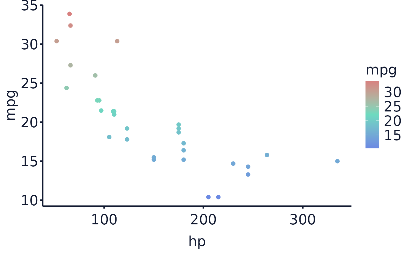 cars_plot <- ggplot(data = mtcars, aes(x = hp, y = mpg, colour = mpg)) +