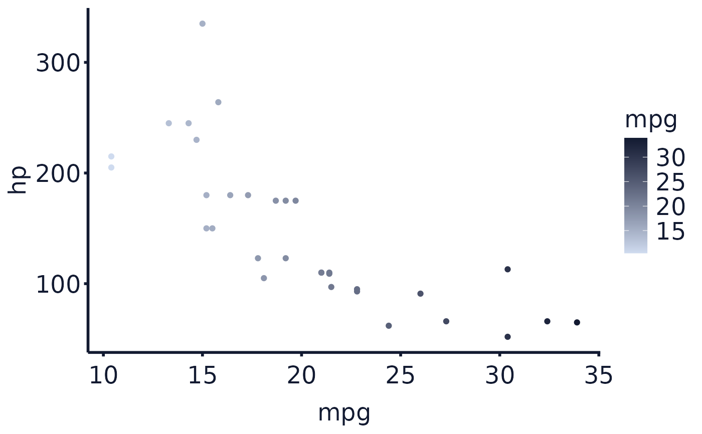 ggplot(data = mtcars, aes(x = mpg, y = hp, colour = mpg)) +